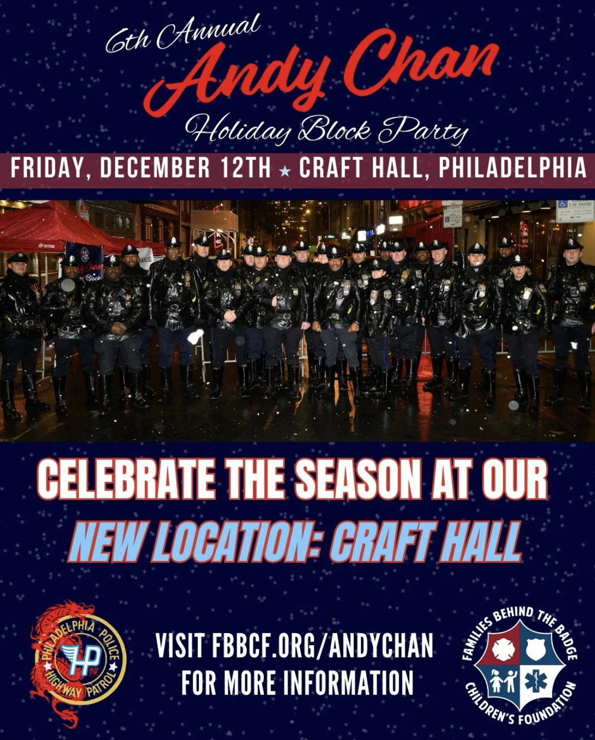 The 6th Annual Andy Chan Holiday Block Party will be held on Friday, December 12, 2025, 4 - 9 PM indoors at Craft Hall (901 N. Delaware Ave., Phila., PA). Proceeds raised from the event will go directly to the family of Philadelphia Highway Patrolman Andy Chan, who was critically injured in 2019 and required around-the-clock care until his passing on December 2, 2025.