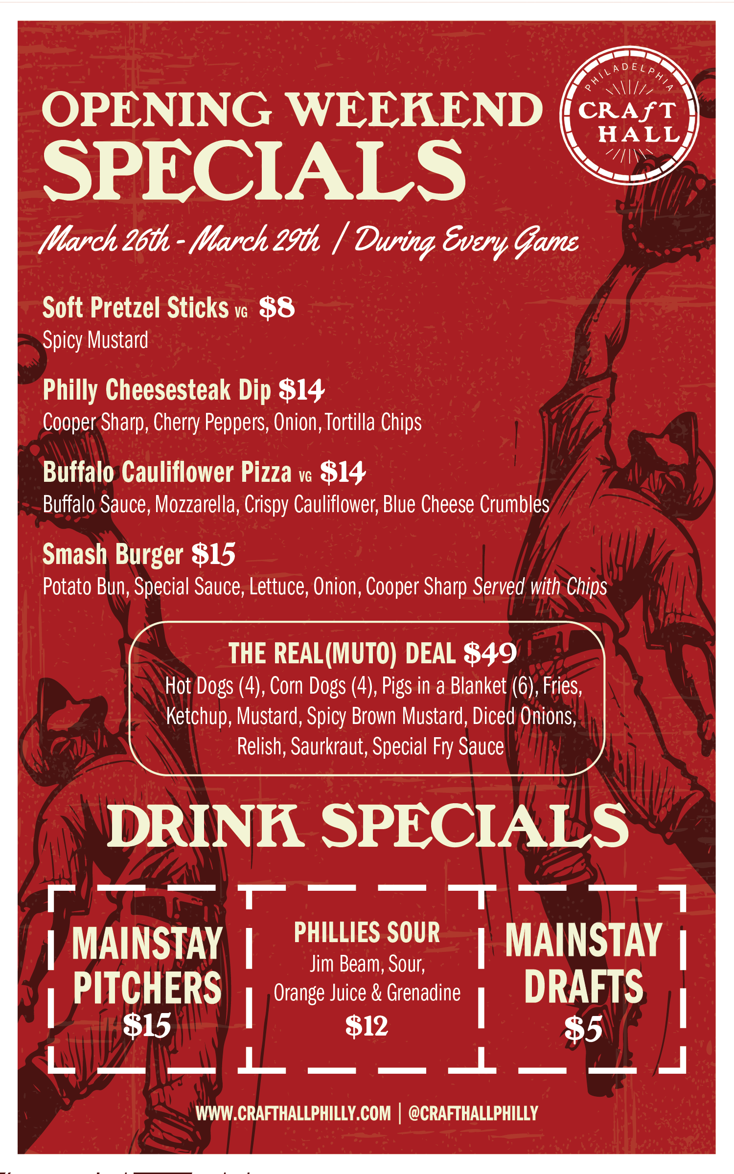 On the drinks side, sip on $5 Mainstay Drafts, grab a $15 Pitcher for the table, or try the Phillies Sour — Jim Beam, sour, OJ, and grenadine for $12. Red, refreshing, and Opening Day approved.